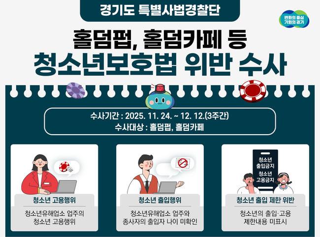 [일간환경연합 한선미 기자] 경기도 특별사법경찰단이 오는 24일부터 12월 12일까지 도내 홀덤펍·홀덤카페를 대상으로 청소년의 출입·고용 등 불법행위를 집중 수사하며, 수능 이후 증가할 수 있는 사행행위 노출을 사전에 차단하기로 했다.