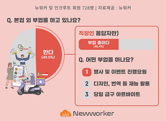 [일간환경연합 김경훈 기자] 기업 주문형 긱워커 플랫폼 뉴워커가 11월 1일부터 16일까지 728명을 대상으로 실시한 설문에서 직장인의 48.4%가 부업을 하고 있다고 답하며 부업 선택의 최우선 기준으로 ‘시간’을 꼽은 것으로 나타났다.