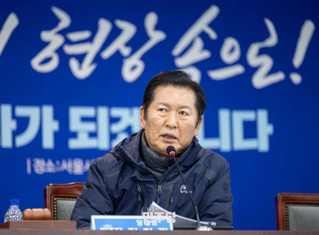 정청래 당대표가 2026.01.07.(수) 서울 송파구에 위치한 가락시장에 방문하여 민생 현장을 살펴본 뒤 서울농수산식품공사에서 현장최고위원회의를 주재하고 있다.