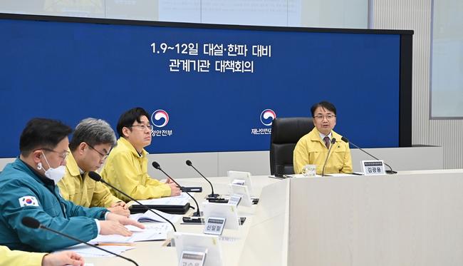 김광용 행정안전부 재난안전관리본부장이 8일 정부세종청사 중앙재난안전상황실에서 1.9~12일 대설 · 한파에 대비한 관계기관 대책회의를 주재하며, 선제적 비상대응체계 구축과 적설 · 제설 취약요인 점검을 당부하고 있다.