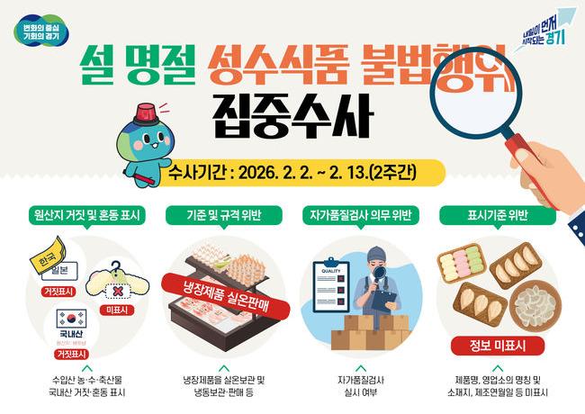 경기도 특별사법경찰단이 설 명절을 앞두고 2월 2일부터 13일까지 도내 식품제조 · 가공업소와 중 · 대형마트를 대상으로 성수식품 불법 유통 행위에 대한 집중 수사에 나선다.
