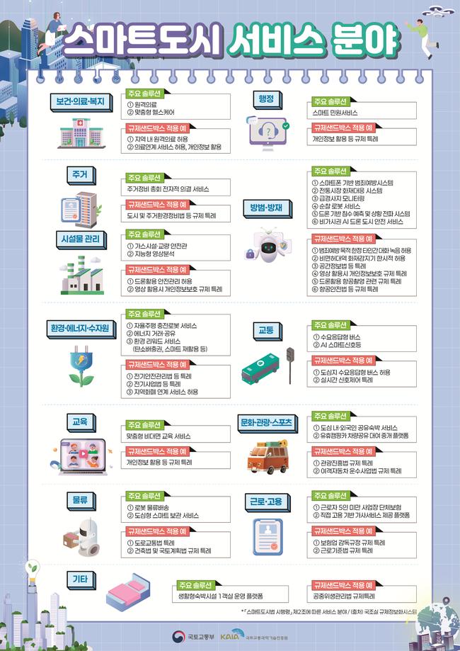국토교통부는 스마트도시 기술 · 서비스의 규제 완화와 해소를 지원하기 위해 2일부터 행정, 보건 · 의료 · 복지 분야를 중심으로 스마트도시 규제샌드박스 실증사업 공모를 시작한다고 밝혔다.