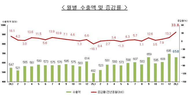 관세청이 발표한 2026년 1월 수출입 확정치에 따르면, 수출은 전년 동월 대비 33.8% 증가한 658억 달러, 수입은 11.6% 늘어난 571억 달러로 집계됐다. 무역수지는 87억 달러 흑자를 기록하며 12개월 연속 흑자를 이어갔다.