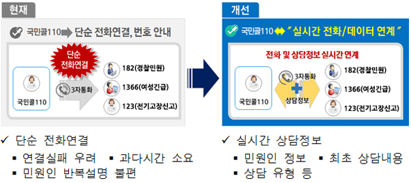 권익위는 우선 여성긴급·경찰민원·전기고장신고 시스템을 실시간으로 연결했으며 추후 나머지 13개 비긴급 신고상담 전화와의 연계도 단계적으로 확대할 방침이다.