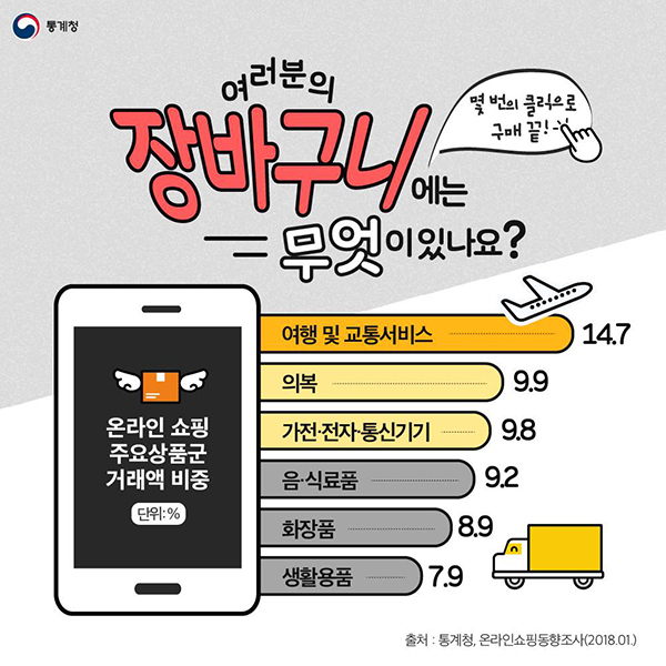 전체 온라인 쇼핑에서 차지하는 비중이 높은 항목은 여행 및 교통서비스 14.7%, 의복 9.9%, 가전·전자·통신기기 9.8%, 음·식료품 9.2%, 화장품 8.9%, 생활용품 7.9% 등이었습니다.