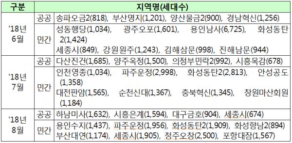 세부 입주물량을 보면, 수도권은 오는 6월 용인남사, 광주오포 등 25,831세대, 7월 파주운정, 화성동탄2 등 18,582세대, 8월 화성동탄2, 하남미사 등 13,931세대가 입주할 예정이며, 지방은 오는 6월 강원원주, 부산명지 등 17,548세대, 7월 대전판암, 충북혁신 등 11,793세대, 8월 청주오창, 세종시 등 21,354세대가 입주할 예정으로 조사됐다.