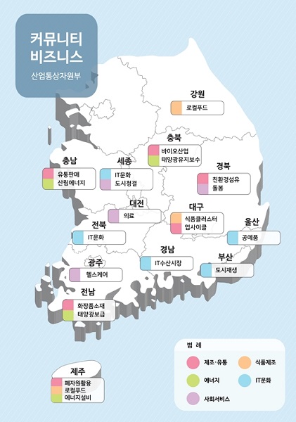 시도별 중점추진 프로젝트 현황 이번 행사는 지난 2월 산업부가 시행한 '2018년도 커뮤니티비즈니스 활성화사업'에 선정된 25개 신규과제 수행기관이 처음으로 모이는 자리이며,제조·유통, 에너지, 정보기술문화, 식품 등 사회적경제기업, 중간지원조직, 지역혁신기관 등 커뮤니티비즈니스 사업관계자 130여명이 직접 참석했다.