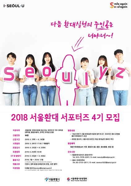 서울환대 서포터즈(Seoulyz)’ 4기 모집 서울환대 서포터즈는 관광객들에 대한 환대가 관광 종사자 뿐만 아니라 시민들의 자발적인 관심과 참여가 중요하다는 점에서 2017년부터 시작되어, 2017년 107명이 활동을 한 바 있으며, 2018년 현재 3기 50명이 활동 중이다.