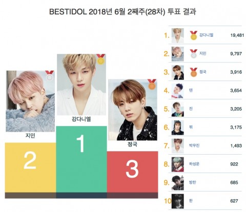 [일간환경연합 신상미 기자]6월 2주차 베스트 아이돌 투표에서도 강다니엘(워너원)이 압도적인 차이로 1위를 차지했다. 2위와 3위는 지난 주와 마찬가지로 지민(방탄소년단)과 정국(방탄소년단)이 차지했다. 지민은 4주 연속 2위 자리를 지켰다.