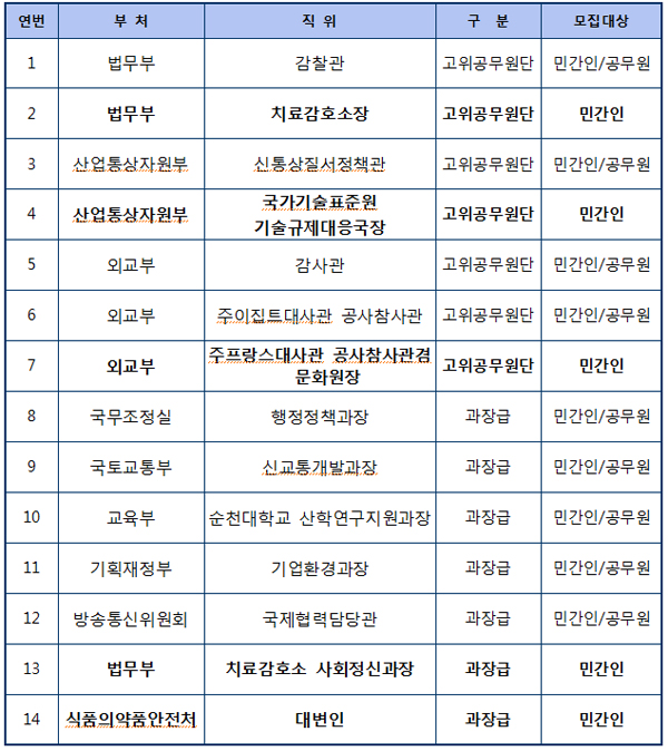 9월에 공모하는 직위 중 고위공무원단은 법무부 감찰관과 치료감호소장, 산업통상자원부 신통상질서정책관, 국가기술표준원 기술규제대응국장, 외교부 감사관, 주이집트대사관 공사참사관, 주프랑스대사관 공사참사관 겸 문화원장 등 7개 자리다.