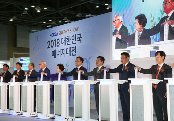 2일 고양 킨텍스 제1전시장에서 열린 2018 대한민국 에너지대전에서 정승일(오른쪽에서 세 번째) 산업통상자원부 차관을 비롯한 인사들이 개막 버튼을 터치하고 있다. (사진=(c) 연합뉴스) |