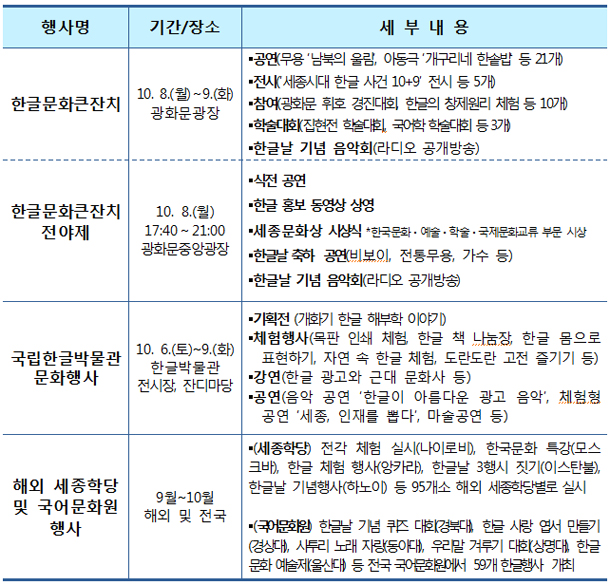 한글의 가치를 되새기고 국민들이 함께 참여하는 형태로 마련된 이번 행사는 서울 광화문 광장과 세종로 공원을 비롯해 국립한글박물관, 전국 국어문화원, 해외 세종학당 등에서 열릴 예정이다.