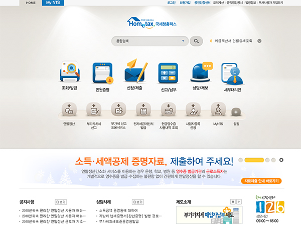 국세청 홈택스 메인 화면.연말정산간소화는 근로자와 원천징수의무자인 회사가 쉽게 연말정산을 할 수 있도록 관련 소득·세액공제 증명자료를 조회할 수 있는 서비스다.