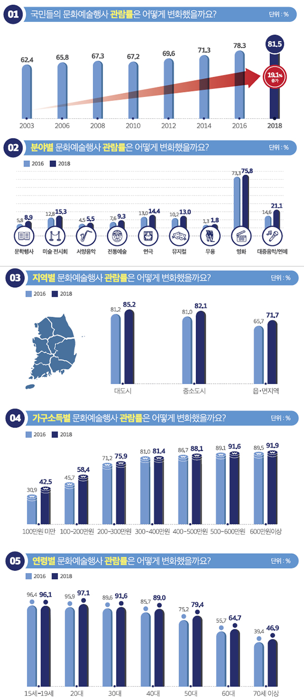 11일 문화체육관광부와 한국문화관광연구원이 발표한 ‘2018년 문화향수실태조사’ 결과에 따르면, 우리나라 국민의 지난 1년간 문화예술행사 관람률은 81.5%로 2016년 78.3%보다 3.2%포인트 상승했다.