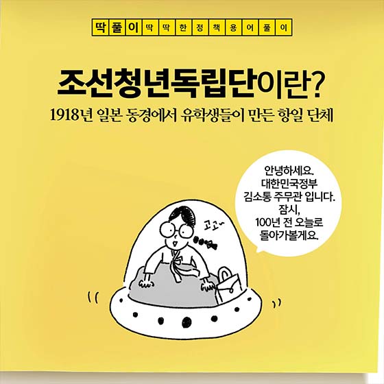 조선청년독립단이란 1918년 일본 동경에서 유학생들이 만든 항일 단체입니다. 1918년 말, 일제강점 하의 어려운 상황에서도 학업을 이어가던 재일동경유학생들은 늘 본토에서 핍박받는 동포들이 마음의 큰 짐이었습니다.