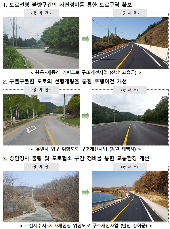 지방도로 위험구간 구조개선은 지방도로의 급경사나 급커브 등 도로시설기준에 맞지 않는 위험구간을 정비해 교통사고 발생 가능성을 줄이고 주민불편을 해소하는 사업이다.