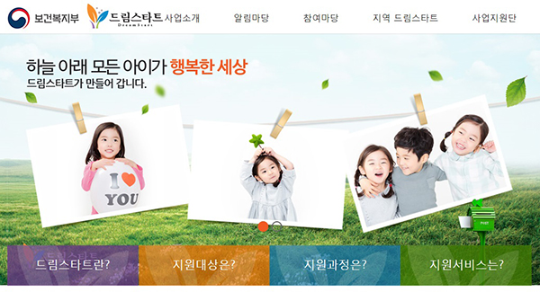 보건복지부의 드림스타트 누리집 첫 화면드림스타트는 생활이 어려운 가구의 아동과 가족을 대상으로 빈곤의 대물림을 차단하기 위해 맞춤형 통합서비스를 제공하는 사업이다.