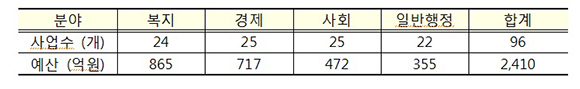 이번에 각 부처에서 요구한 96개 사업은 복지·경제·사회·일반행정 4개 분야에 고르게 분포됐다.