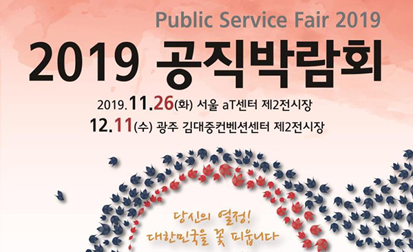11월 26일 서울 aT센터 제2전시장에서 개최하는 ‘2019 공직박람회’.이번 박람회는 ‘당신의 열정! 대한민국을 꽃 피웁니다’를 주제로 중앙행정기관과 지방자치단체, 헌법기관 및 공공기관 등 총 72개 기관이 참여해 공직 채용안내와 맞춤형 채용 서비스, 부대행사 등 3개 섹션으로 진행한다.