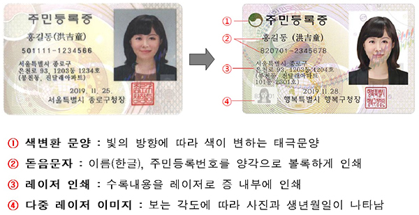 특히 이름과 주민등록번호는 돋음문자로 새겨 위변조 방지기능을 강화했다.