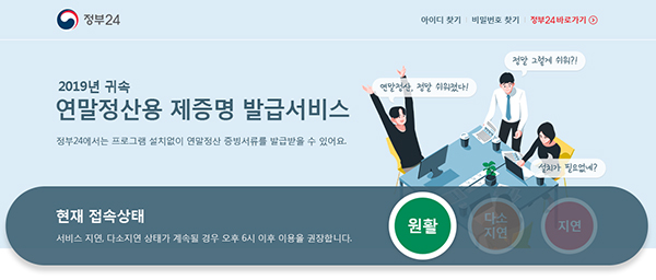 행정안전부는 일평균 30여만 명 이상의 국민이 이용하고 있는 ‘정부24’에 연말정산기간 동안 이용자 접속이 급증할 것에 대비해 별도의 화면을 구성하고 서버의 용량을 증설했다고 밝혔다.